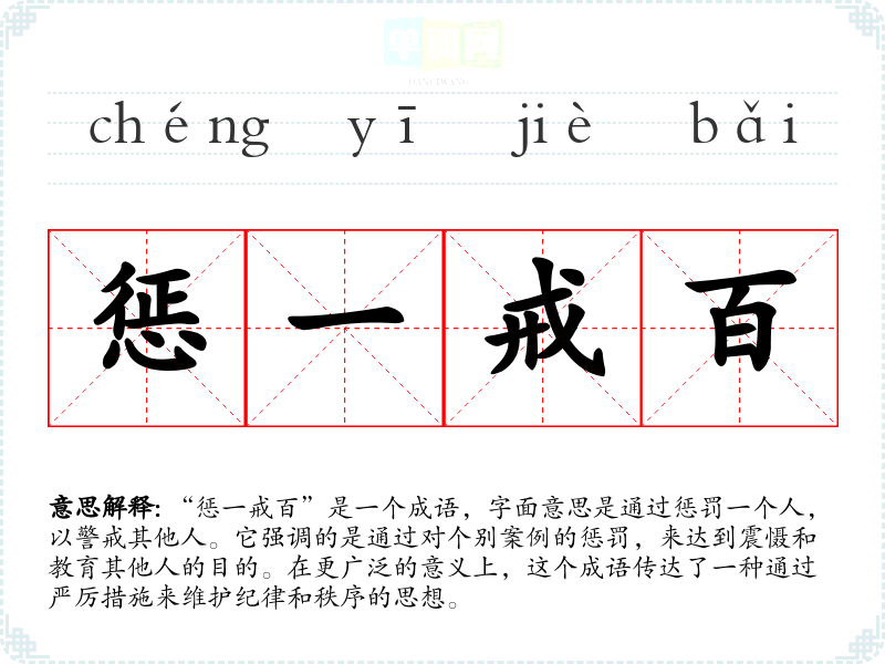 - 日常对话:例如,家长在教育孩子时,可能会提到“惩一戒百”的理念,强调行为规范的重要性。