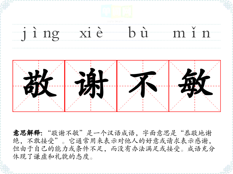 “敬谢不敏”是一个汉语成语,字面意思是“恭敬地谢绝,不敢接受”。它通常用来表示对他人的好意或请求表示感谢,但由于自己的能力或条件不足,而没有办法满足或接受。成语充分体现了谦虚和礼貌的态度。