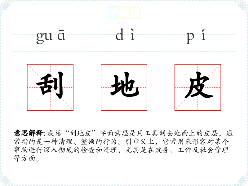 成语“刮地皮”字面意思是用工具刮去地面上的皮层,通常指的是一种清理、整顿的行为。引申义上,它常用来形容对某个事物进行深入彻底的检查和清理,尤其是在政务、工作及社会管理等方面。