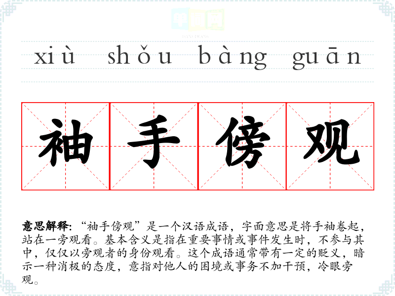 | 袖手旁观 | 把手笼在袖子里,在一旁观看。比喻置身事外,既不过问,也不协助别人。 |