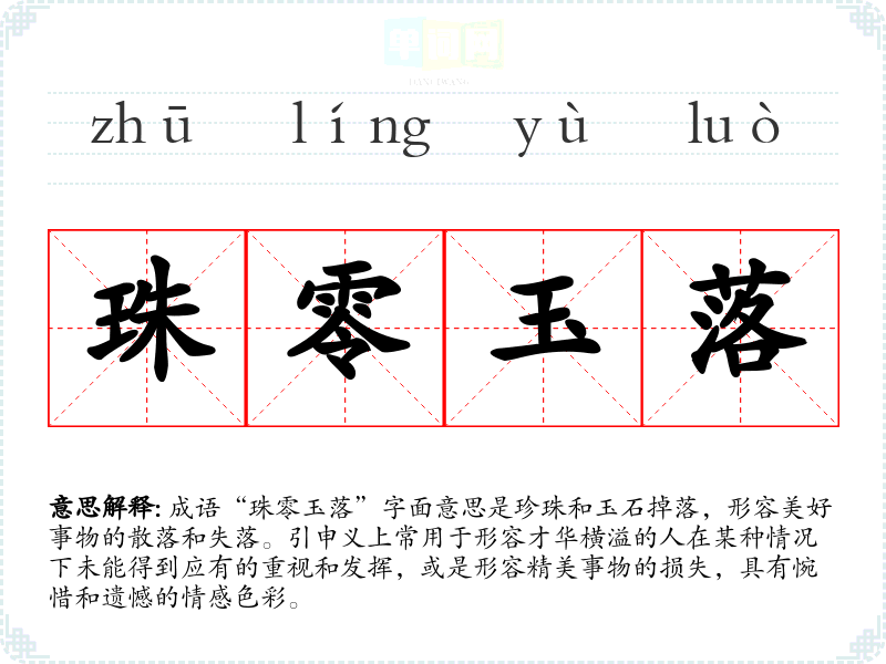 成语“珠零玉落”字面意思是珍珠和玉石掉落,形容美好事物的散落和失落。引申义上常用于形容才华横溢的人在某种情况下未能得到应有的重视和发挥,或是形容精美事物的损失,具有惋惜和遗憾的情感色彩。