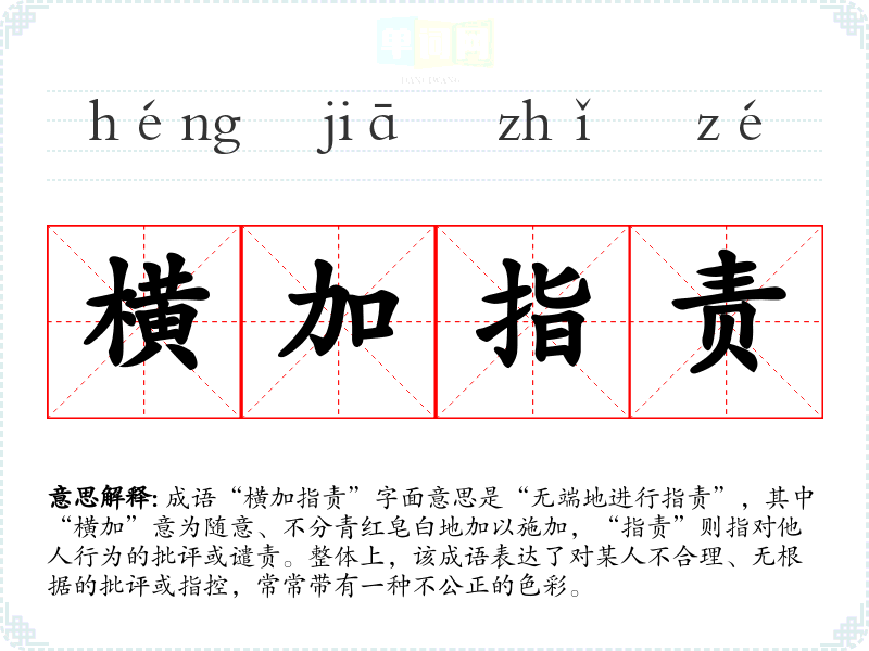 成语“横加指责”字面意思是“无端地进行指责”,其中“横加”意为随意、不分青红皂白地加以施加,“指责”则指对他人行为的批评或谴责。整体上,该成语表达了对某人不合理、无根据的批评或指控,常常带有一种不公正的色彩。