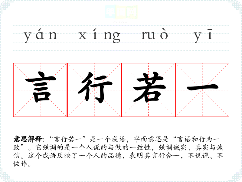 “言行若一”是一个成语,字面意思是“言语和行为一致”。它强调的是一个人说的与做的一致性,强调诚实、真实与诚信。这个成语反映了一个人的品德,表明其言行合一,不说谎、不做作。