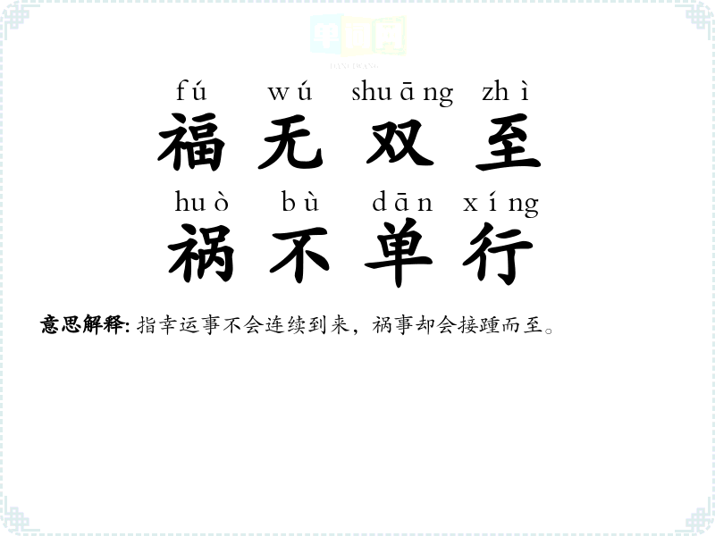 | 福不重至,祸必重来 | 福不会接连而来,祸灾却会接踵而至。 |