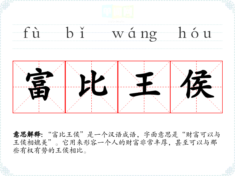 “富比王侯”是一个汉语成语,字面意思是“财富可以与王侯相媲美”。它用来形容一个人的财富非常丰厚,甚至可以与那些有权有势的王侯相比。