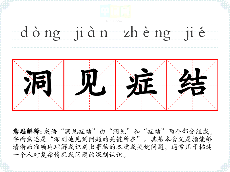 成语“洞见症结”由“洞见”和“症结”两个部分组成。字面意思是“深刻地见到问题的关键所在”。其基本含义是指能够清晰而准确地理解或识别出事物的本质或关键问题,通常用于描述一个人对复杂情况或问题的深刻认识。