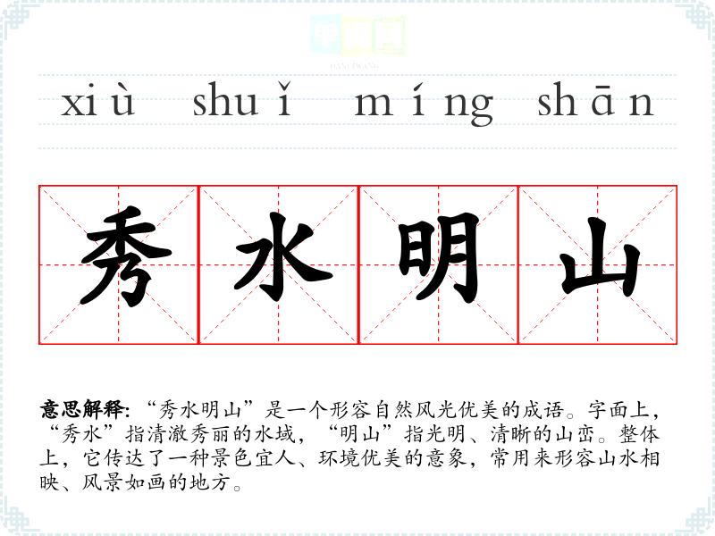 “秀水明山”是一个形容自然风光优美的成语。字面上,“秀水”指清澈秀丽的水域,“明山”指光明、清晰的山峦。整体上,它传达了一种景色宜人、环境优美的意象,常用来形容山水相映、风景如画的地方。