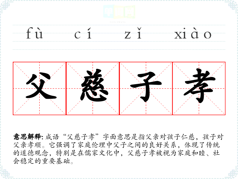 成语“父慈子孝”字面意思是指父亲对孩子仁慈,孩子对父亲孝顺。它强调了家庭伦理中父子之间的良好关系,体现了传统的道德观念,特别是在儒家文化中,父慈子孝被视为家庭和睦、社会稳定的重要基础。