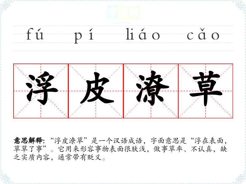 “浮皮潦草”是一个汉语成语,字面意思是“浮在表面,草草了事”。它用来形容事物表面很肤浅,做事草率、不认真,缺乏实质内容,通常带有贬义。