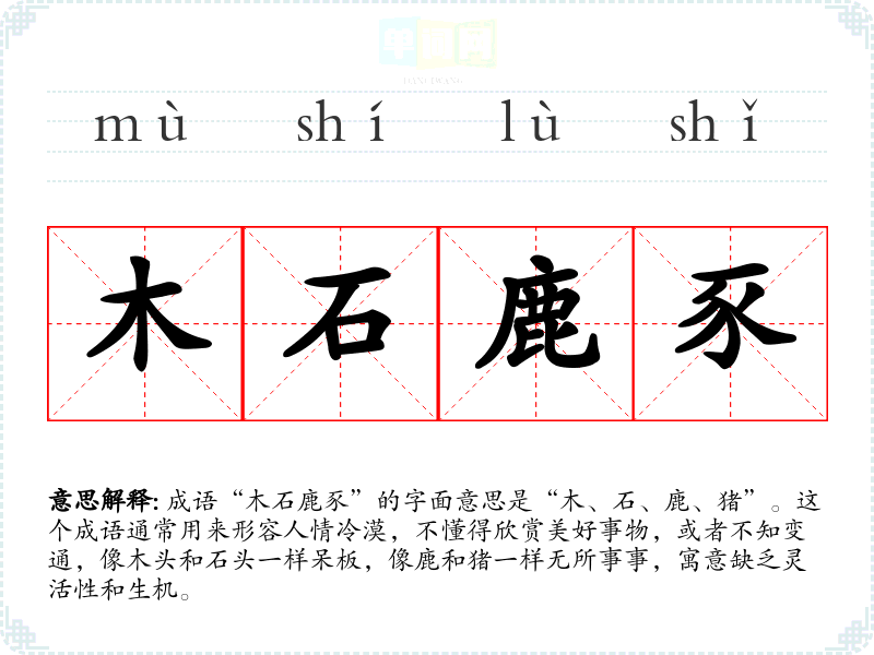 成语“木石鹿豕”的字面意思是“木、石、鹿、猪”。这个成语通常用来形容人情冷漠,不懂得欣赏美好事物,或者不知变通,像木头和石头一样呆板,像鹿和猪一样无所事事,寓意缺乏灵活性和生机。