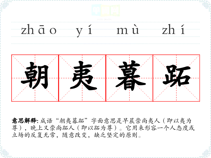 成语“朝夷暮跖”字面意思是早晨崇尚夷人(即以夷为尊),晚上又崇尚跖人(即以跖为尊)。它用来形容一个人态度或立场的反复无常,随意改变,缺乏坚定的原则。