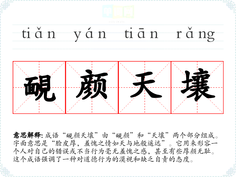 成语“靦颜天壤”由“靦颜”和“天壤”两个部分组成。字面意思是“脸皮厚,羞愧之情如天与地般遥远”。它用来形容一个人对自己的错误或不当行为毫无羞愧之感,甚至有些厚颜无耻。这个成语强调了一种对道德行为的漠视和缺乏自责的态度。