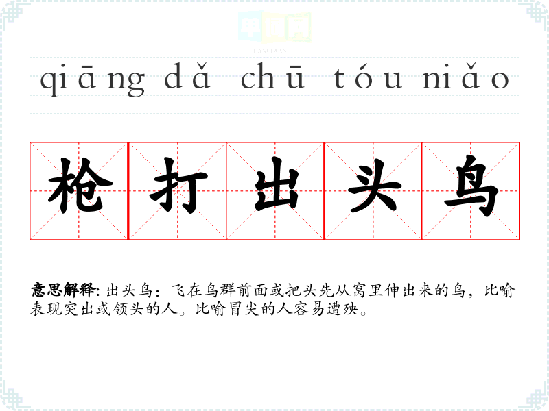 | 枪打出头鸟 | 出头鸟:飞在鸟群前面或把头先从窝里伸出来的鸟,比喻表现突出或领头的人。比喻冒尖的人容易遭殃。 |