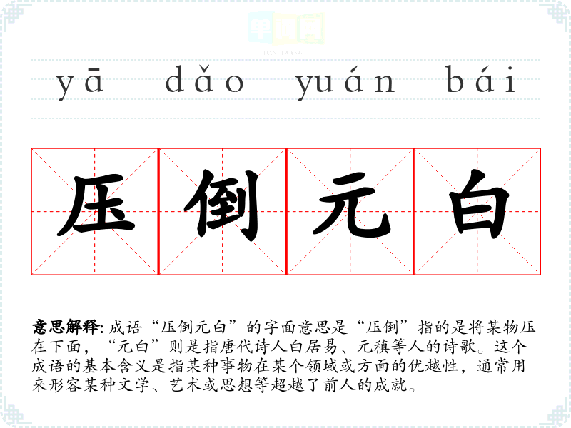 成语“压倒元白”的字面意思是“压倒”指的是将某物压在下面,“元白”则是指唐代诗人白居易、元稹等人的诗歌。这个成语的基本含义是指某种事物在某个领域或方面的优越性,通常用来形容某种文学、艺术或思想等超越了前人的成就。