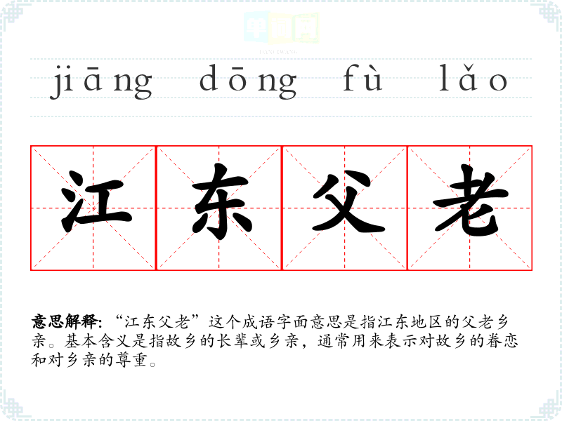 “江东父老”这个成语字面意思是指江东地区的父老乡亲。基本含义是指故乡的长辈或乡亲,通常用来表示对故乡的眷恋和对乡亲的尊重。