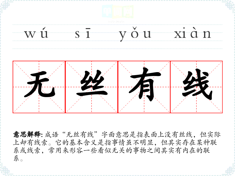 成语“无丝有线”字面意思是指表面上没有丝线,但实际上却有线索。它的基本含义是指事情虽不明显,但其实存在某种联系或线索,常用来形容一些看似无关的事物之间其实有内在的联系。