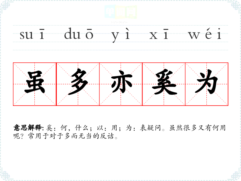 | 虽多亦奚为 | 奚:何,什么;以:用;为:表疑问。虽然很多又有何用呢?常用于对于多而无当的反诘。 |