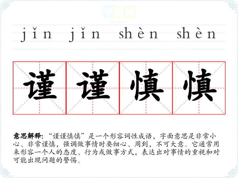 “谨谨慎慎”是一个形容词性成语,字面意思是非常小心、非常谨慎,强调做事情时要细心、周到,不可大意。它通常用来形容一个人的态度、行为或做事方式,表达出对事情的重视和对可能出现问题的警惕。