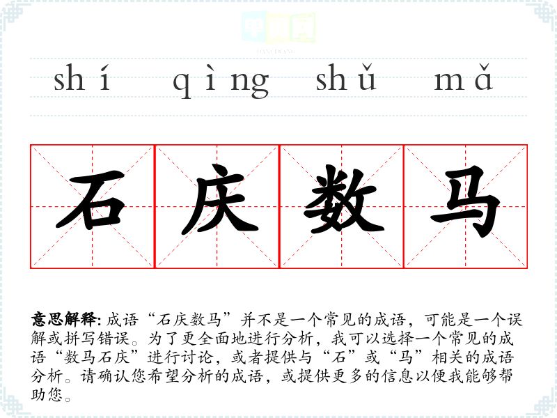 成语“石庆数马”并不是一个常见的成语,可能是一个误解或拼写错误。为了更全面地进行分析,我可以选择一个常见的成语“数马石庆”进行讨论,或者提供与“石”或“马”相关的成语分析。请确认您希望分析的成语,或提供更多的信息以便我能够帮助您。