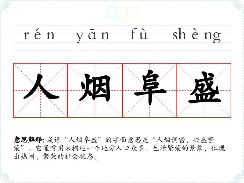 成语“人烟阜盛”的字面意思是“人烟稠密,兴盛繁荣”。它通常用来描述一个地方人口众多、生活繁荣的景象,体现出热闹、繁荣的社会状态。