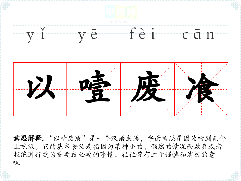 “以噎废飡”是一个汉语成语,字面意思是因为噎到而停止吃饭。它的基本含义是指因为某种小的、偶然的情况而放弃或者拒绝进行更为重要或必要的事情,往往带有过于谨慎和消极的意味。