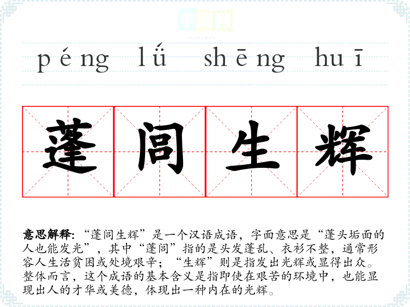 “蓬闾生辉”是一个汉语成语,字面意思是“蓬头垢面的人也能发光”,其中“蓬闾”指的是头发蓬乱、衣衫不整,通常形容人生活贫困或处境艰辛;“生辉”则是指发出光辉或显得出众。整体而言,这个成语的基本含义是指即使在艰苦的环境中,也能显现出人的才华或美德,体现出一种内在的光辉。