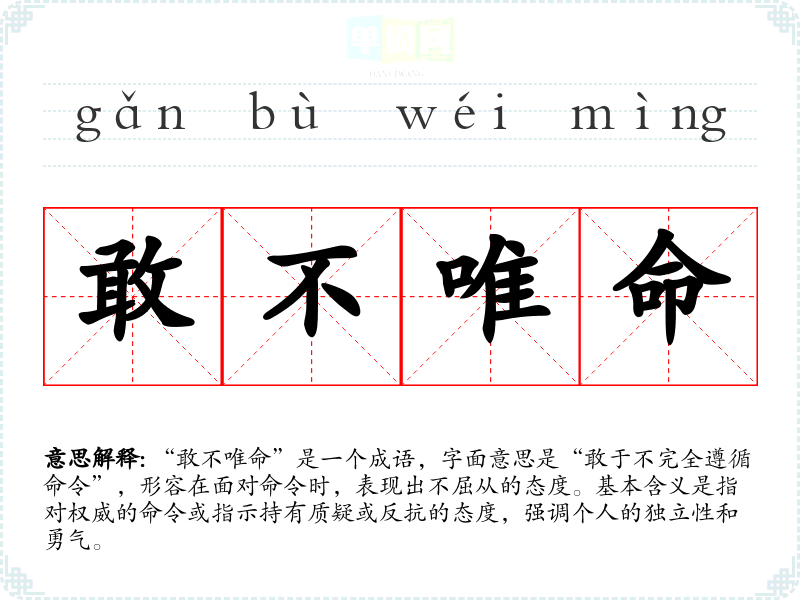 通过对“敢不唯命”的学习,我更加理解了个人独立思考的重要性。这一成语不仅在历史上具有重要意义,也在现代社会中提醒人们勇敢表达自己的观点。在语言学习和表达中,理解并运用这样的成语,有助于增强我的表达能力和思维深度。