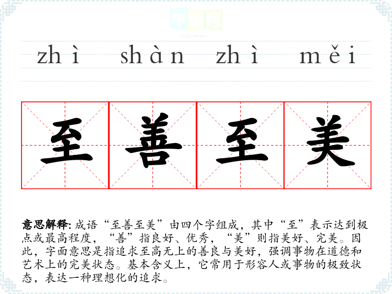 “至善至美”出自《礼记·大学》,原文为“大学之道,在明明德,在亲民,在止于至善。”后来的解释和演绎中,逐渐形成了“至善至美”的成语。该成语强调追求完美的理念,反映了古代儒家思想对道德与美的高度重视。