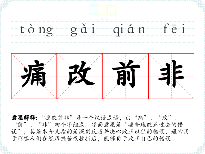 “痛改前非”是一个汉语成语,由“痛”、“改”、“前”、“非”四个字组成。字面意思是“痛苦地改正过去的错误”,其基本含义指的是深刻反省并决心改正以往的错误,通常用于形容人们在经历痛苦或挫折后,能够勇于改正自己的错误。