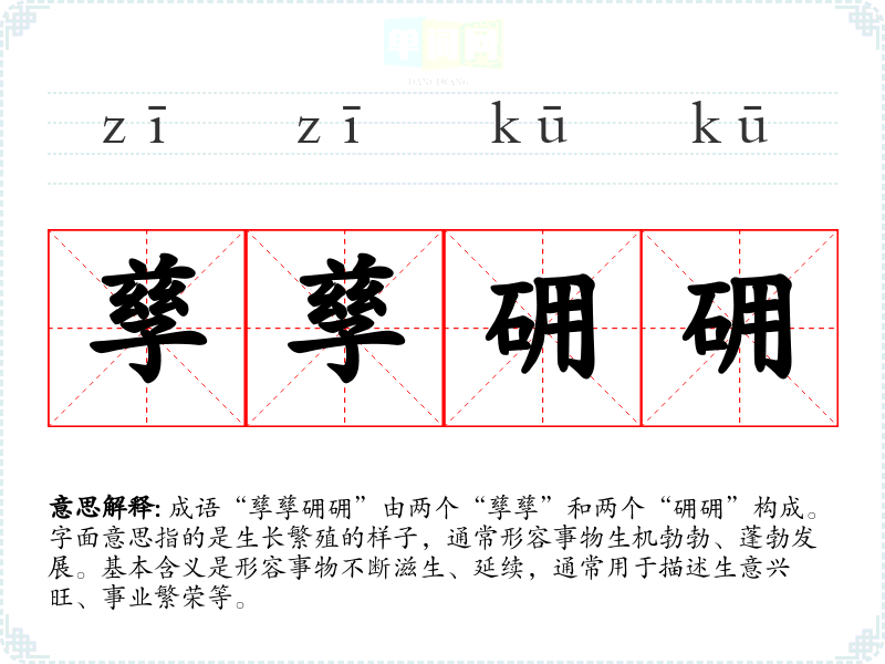 成语“孳孳砽砽”由两个“孳孳”和两个“砽砽”构成。字面意思指的是生长繁殖的样子,通常形容事物生机勃勃、蓬勃发展。基本含义是形容事物不断滋生、延续,通常用于描述生意兴旺、事业繁荣等。