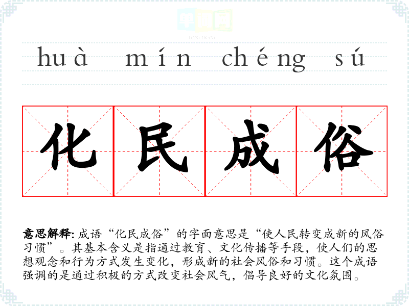 成语“化民成俗”的字面意思是“使人民转变成新的风俗惯”。其基本含义是指通过教育、文化传播等手段,使人们的思想观念和行为方式发生变化,形成新的社会风俗和惯。这个成语强调的是通过积极的方式改变社会风气,倡导良好的文化氛围。