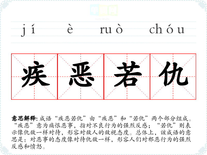 成语“疾恶若仇”由“疾恶”和“若仇”两个部分组成。“疾恶”意为痛恨恶事,指对不良行为的强烈反感;“若仇”则表示像仇敌一样对待,形容对敌人的敌视态度。总体上,该成语的意思是:对恶事的态度像对待仇敌一样,形容人们对邪恶行为的强烈反感和愤怒。
