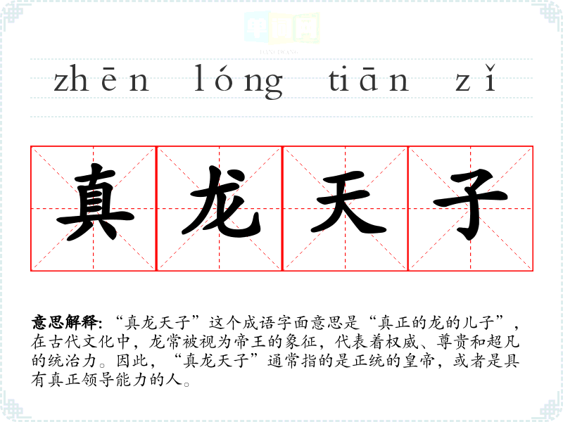 “真龙天子”这个成语字面意思是“真正的龙的儿子”,在古代文化中,龙常被视为帝王的象征,代表着权威、尊贵和超凡的统治力。因此,“真龙天子”通常指的是正统的**,或者是具有真正领导能力的人。