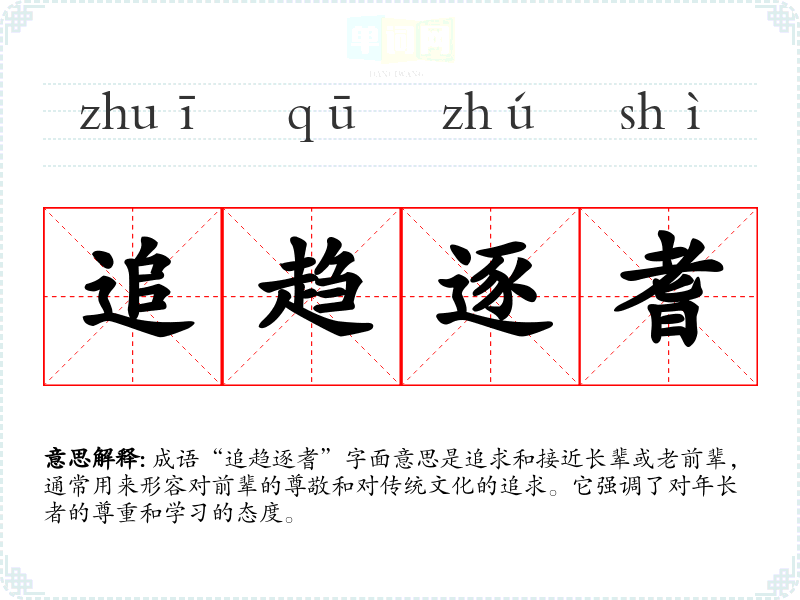 “追趋逐耆”并不是一个广泛流传的成语,可能是现代人对传统文化中尊老敬贤精神的一种概括表现。它与**古代儒家思想中的“尊老爱幼”有着密切的关系,强调了在社会和家庭中对长辈的尊重。