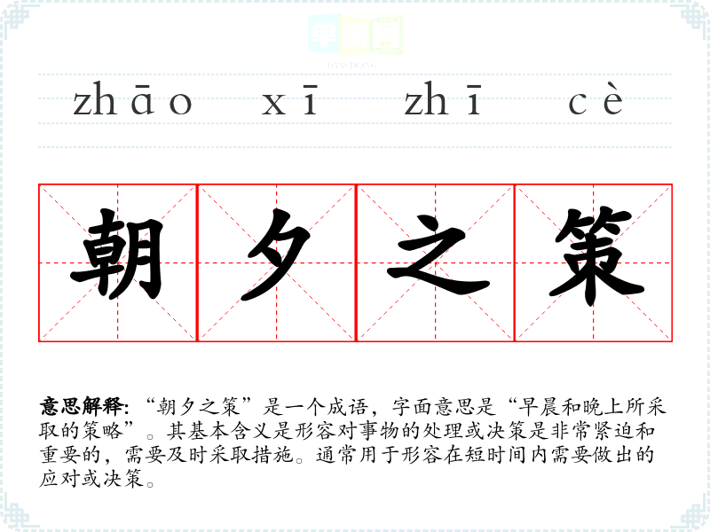 - 日常对话:在朋友间讨论如何应对突发**时,可以提到“朝夕之策”来强调解决问题的紧迫性。