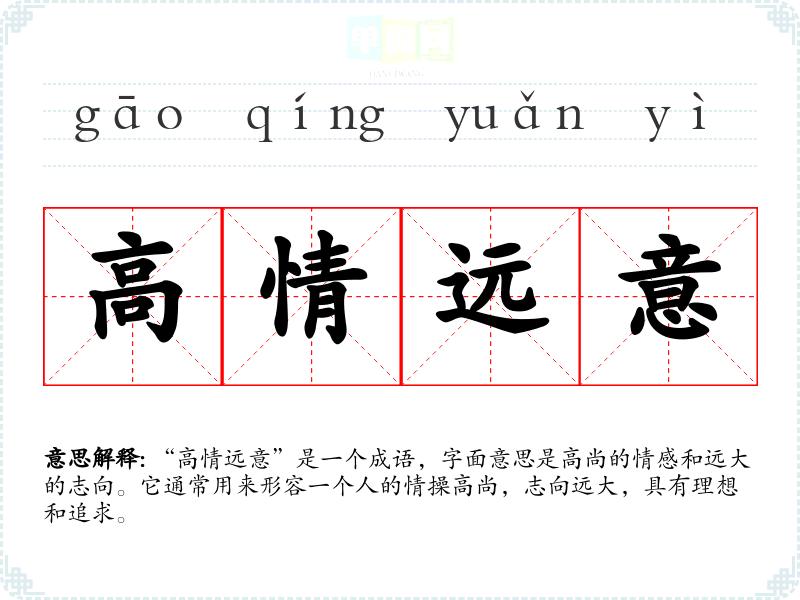 “高情远意”是一个成语,字面意思是高尚的情感和远大的志向。它通常用来形容一个人的情操高尚,志向远大,具有理想和追求。