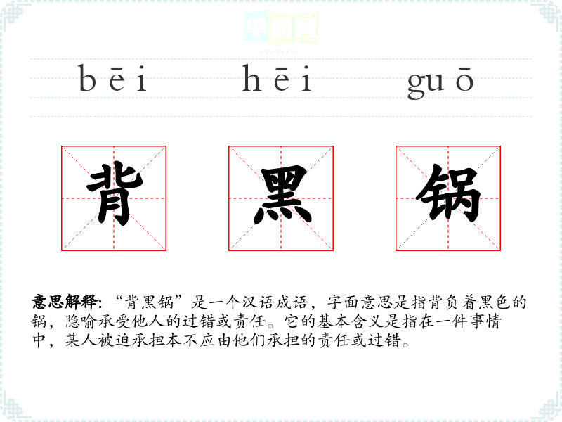 “背黑锅”是一个汉语成语,字面意思是指背负着黑色的锅,隐喻承受他人的过错或责任。它的基本含义是指在一件事情中,某人被迫承担本不应由他们承担的责任或过错。