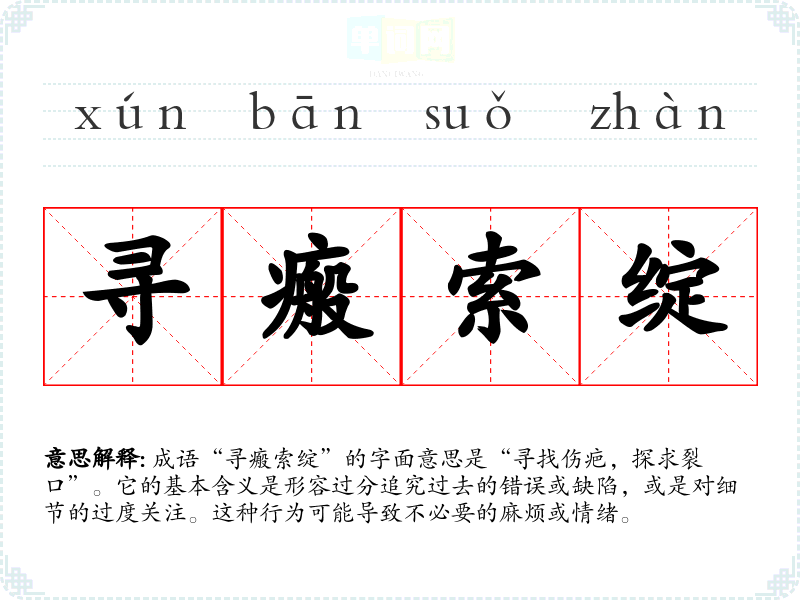成语“寻瘢索绽”的字面意思是“寻找伤疤,探求裂口”。它的基本含义是形容过分追究过去的错误或缺陷,或是对细节的过度关注。这种行为可能导致不必要的麻烦或情绪。