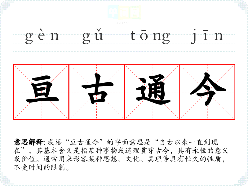 成语“亘古通今”的字面意思是“自古以来一直到现在”,其基本含义是指某种事物或道理贯穿古今,具有永恒的意义或价值。通常用来形容某种思想、文化、真理等具有恒久的性质,不受时间的限制。