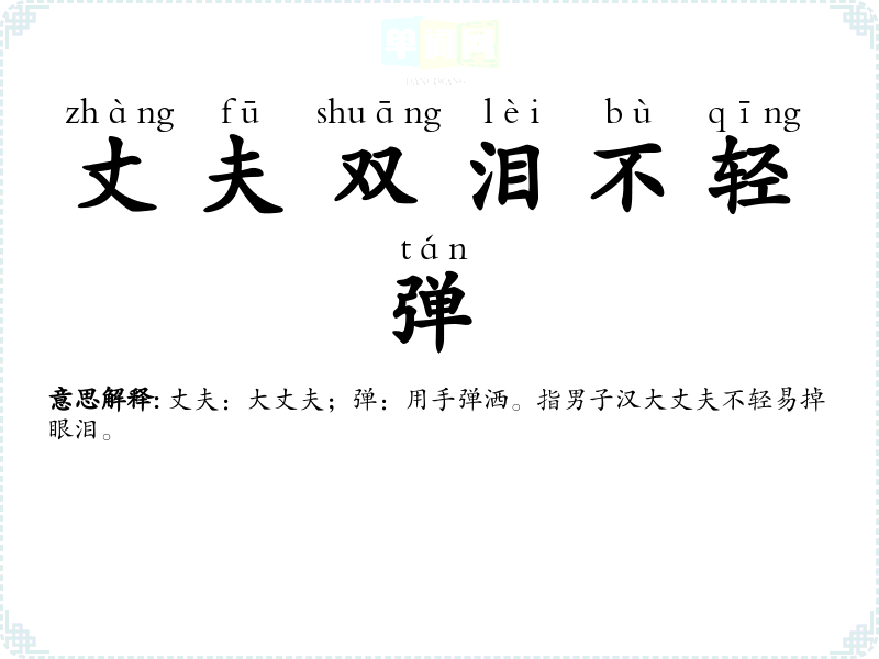 | 丈夫双泪不轻弹 | 丈夫:大丈夫;弹:用手弹洒。指男子汉大丈夫不轻易掉眼泪。 |