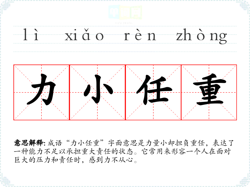 成语“力小任重”字面意思是力量小却担负重任,表达了一种能力不足以承担重大责任的状态。它常用来形容一个人在面对巨大的压力和责任时,感到力不从心。