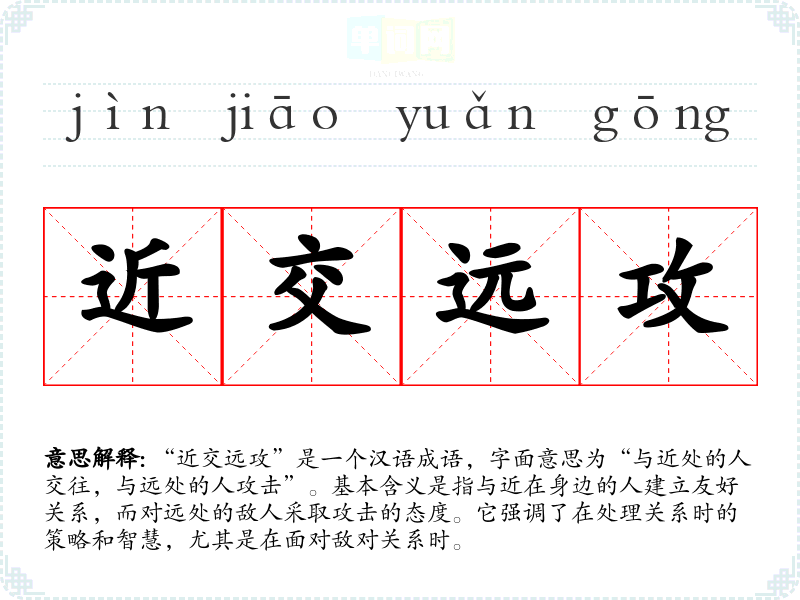 - “一视同仁”:强调对待所有人都一样,没有区分,和“近交远攻”在处理关系上有所不同。