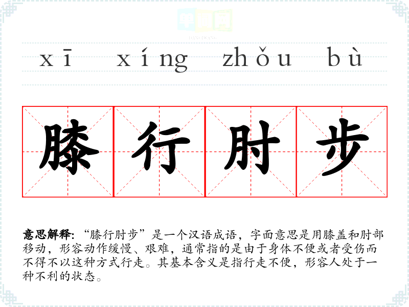 “膝行肘步”是一个汉语成语,字面意思是用膝盖和肘部移动,形容动作缓慢、艰难,通常指的是由于身体不便或者受伤而不得不以这种方式行走。其基本含义是指行走不便,形容人处于一种不利的状态。