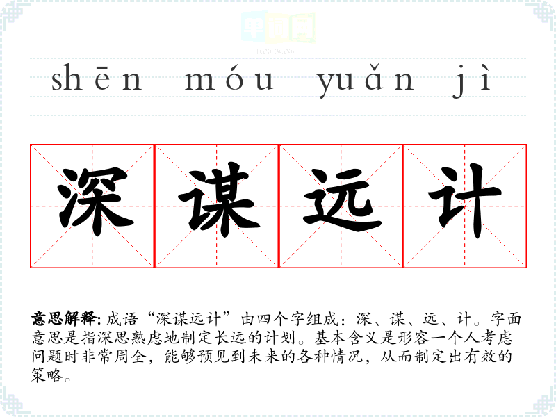 成语“深谋远计”由四个字组成:深、谋、远、计。字面意思是指深思熟虑地制定长远的计划。基本含义是形容一个人考虑问题时非常周全,能够预见到未来的各种情况,从而制定出有效的策略。