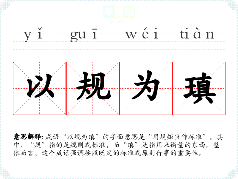 成语“以规为瑱”的字面意思是“用规矩当作标准”。其中,“规”指的是规则或标准,而“瑱”是指用来衡量的东西。整体而言,这个成语强调按照既定的标准或原则行事的重要性。