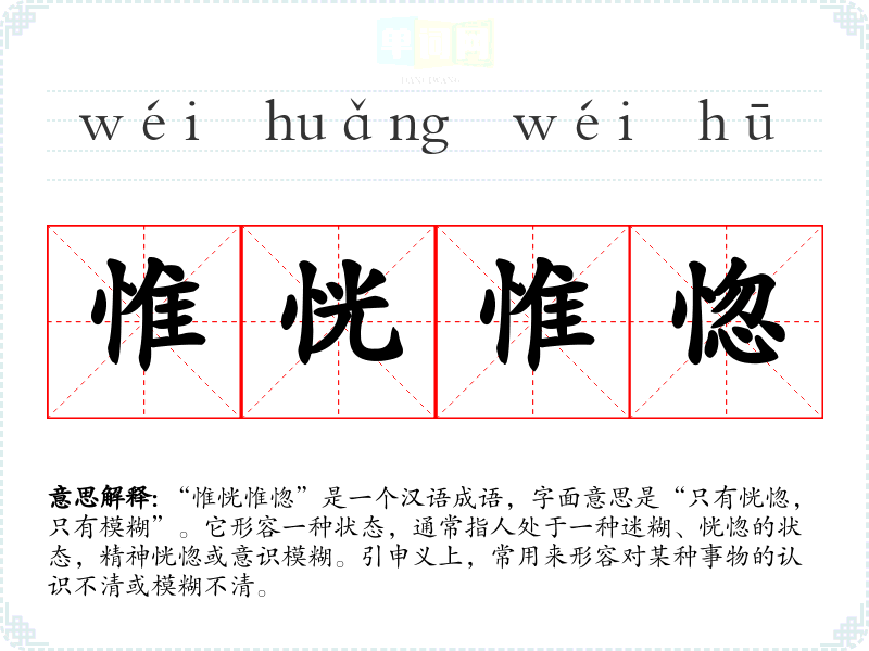 “惟恍惟惚”是一个汉语成语,字面意思是“只有恍惚,只有模糊”。它形容一种状态,通常指人处于一种迷糊、恍惚的状态,精神恍惚或意识模糊。引申义上,常用来形容对某种事物的认识不清或模糊不清。
