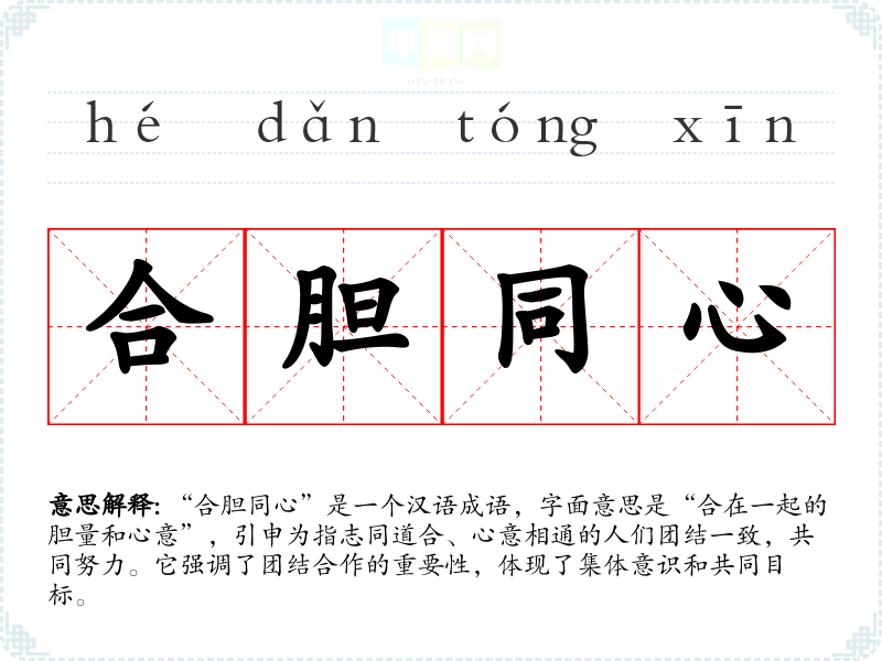 “合胆同心”是一个汉语成语,字面意思是“合在一起的胆量和心意”,引申为指志同道合、心意相通的人们团结一致,共同努力。它强调了团结合作的重要性,体现了集体意识和共同目标。