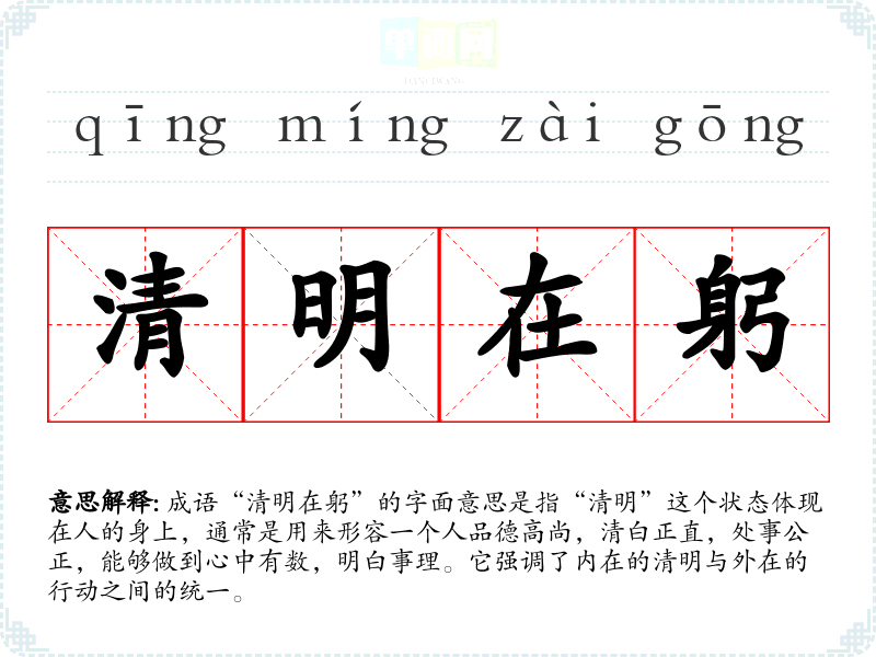 成语“清明在躬”的字面意思是指“清明”这个状态体现在人的身上,通常是用来形容一个人品德高尚,清白正直,处事公正,能够做到心中有数,明白事理。它强调了内在的清明与外在的行动之间的统一。