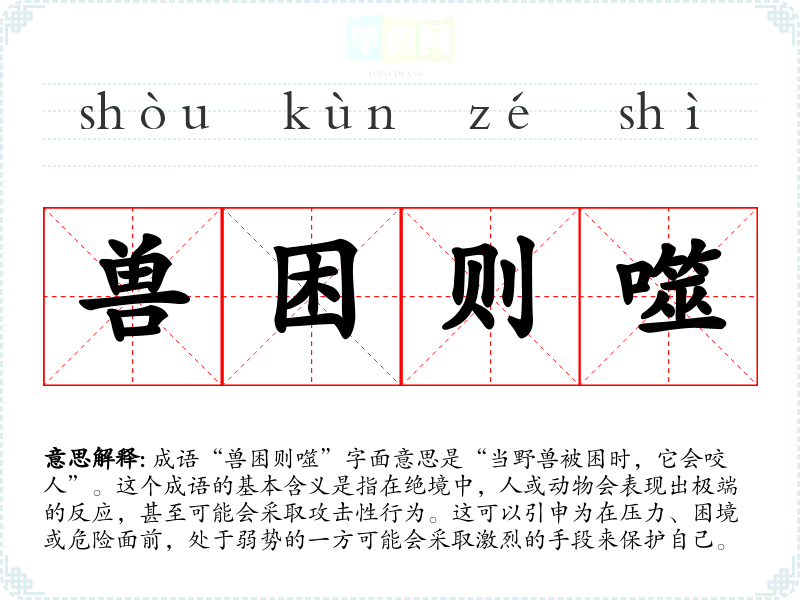 成语“兽困则噬”字面意思是“当野兽被困时,它会咬人”。这个成语的基本含义是指在绝境中,人或动物会表现出极端的反应,甚至可能会采取攻击性行为。这可以引申为在压力、困境或危险面前,处于弱势的一方可能会采取激烈的手段来保护自己。