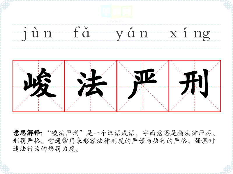 “峻法严刑”是一个汉语成语,字面意思是指法律严厉、刑罚严格。它通常用来形容法律制度的严谨与执行的严格,强调对违法行为的惩罚力度。